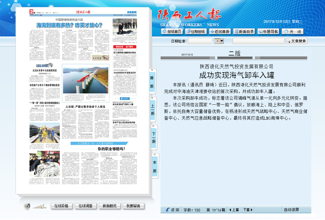 12月12日,陕西工人报(02版)对液化天然气公司成功实现海气卸车入罐进行了报道,现将有关内容摘录如下:陕西工人报讯 近日,陕西液化天然气投资发展有限公司顺利完成对中海油天津港接收站的首次采购,并成功卸车…