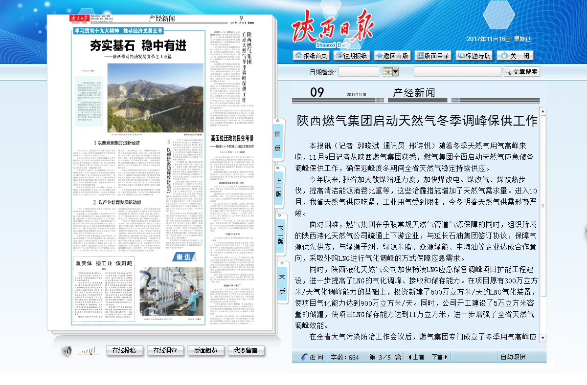 2017年11月16日,陕西日报对陕西燃气集团启动天然气冬季保供工作进行了报道,现将有关内容摘录如下:陕西日报讯 随着冬季天然气用气高峰来临,11月9日记者从陕西燃气集团获悉,燃气集团全面启动天然气应急储备调…