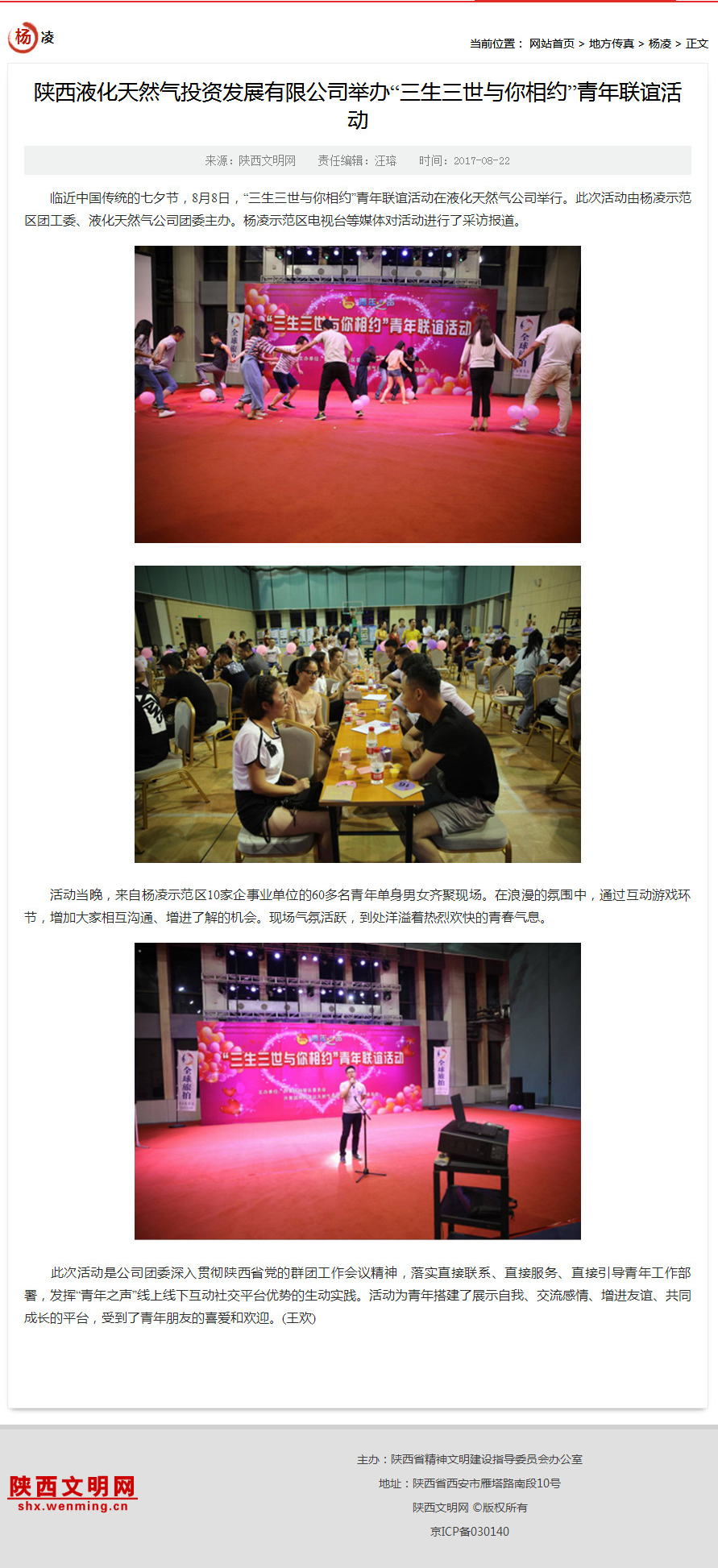 2017年8月22日,陕西文明网对液化天然气公司举办三生三世与你相约青年联谊活动进行了报道,现将有关内容摘录如下:陕西文明网讯 临近中国传统的七夕节,8月8日,三生三世与你相约青年联谊活动在液化天然气公司举…