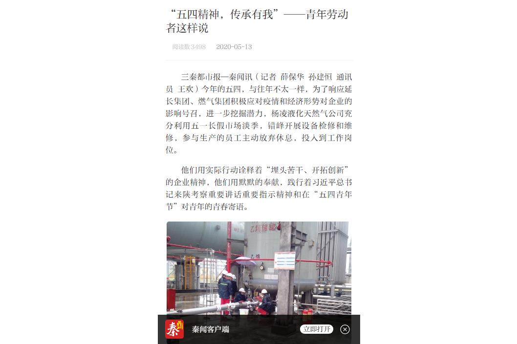 5月13日,三秦都市报-秦网对液化天然气公司五四精神,传承有我——青年劳动者这样说进行报道,现摘录如下:三秦都市报—秦闻讯(记者 薛保华 孙建恒 通讯员 王欢)今年的五四,与往年不太一样,为了响应延长集…