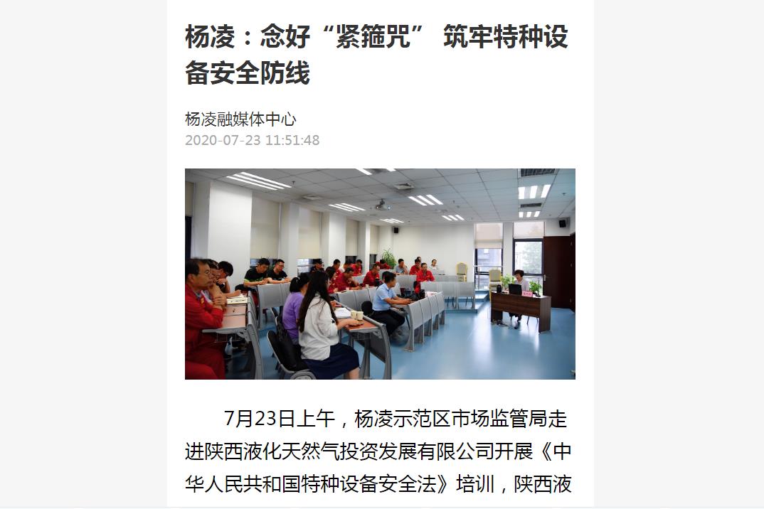7月23日,杨凌融媒体中心报道杨凌示范区市场监管局走进陕西液化天然气投资发展有限公司开展《中华人民共和国特种设备安全法》培训,现摘录