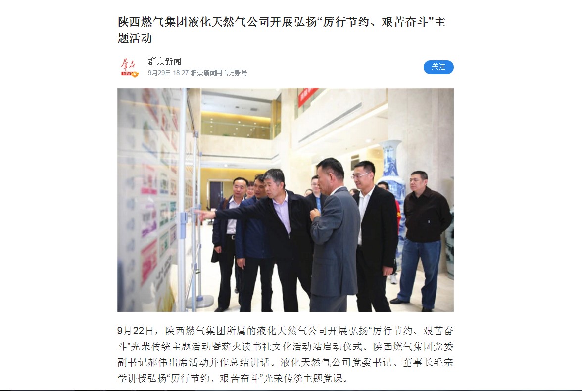 近日,腾讯新闻-群众新闻对陕西燃气集团液化天然气公司开展弘扬厉行节约、艰苦奋斗主题活动进行报道,现摘录如下:9月22日,陕西燃气集团所