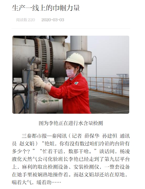 近日,三秦都市报液化天然气公司生产一线的巾帼力量进行报道,现将相关内容摘录如下:三秦都市报—秦闻讯(记者 薛保华 孙建恒 通讯员 赵文娟)艳姐,你有没有数过咱们冷箱的台阶有多少个?忙着干活,数那干啥…