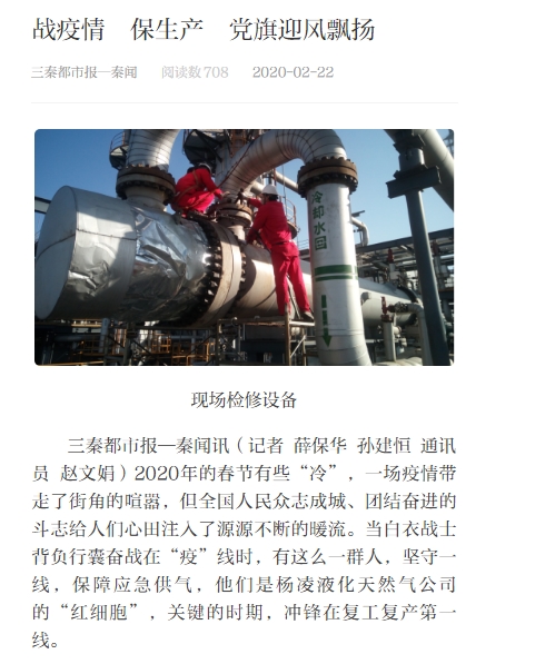 2月22日三秦都市报-秦闻对液化天然气公司基层员工青春有热血 战疫显担当进行报道,现将相关内容摘录如下:三秦都市报—秦闻讯(记者 薛保华 孙建恒 通讯员 王欢)近日,杨凌液化天然气公司杨凌LNG工厂团支部