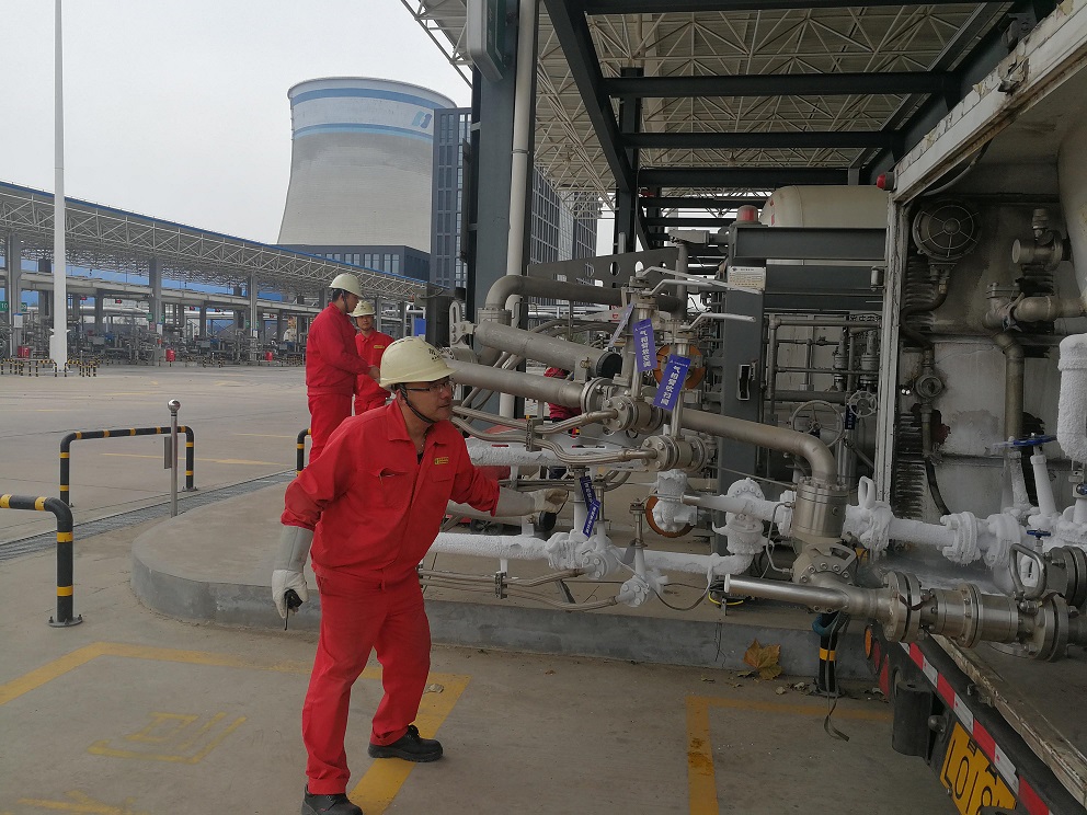 11月26日8时开始,车运LNG接收装置开始预冷,LNG通过卸车撬缓慢进入LNG储罐,并逐步降温,经过对遇冷速度控制,设备管线巡检,易泄露部门冷紧及漏液问题的处置,最终顺利完成了车运LNG接收平台启动工作。