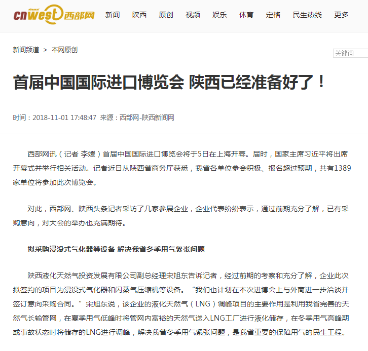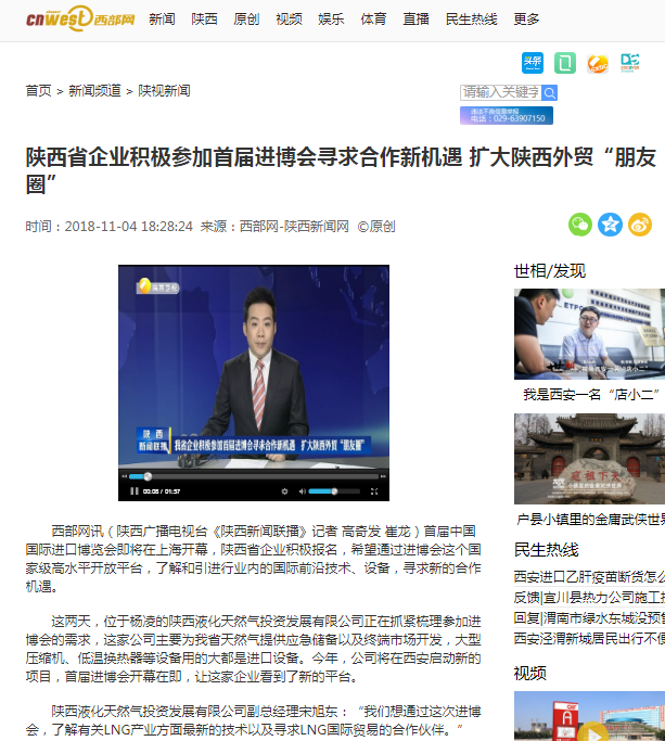 近日,西部网、华商报、三秦都市报、陕西广播电视台等新闻媒体分别对液化天然气公司参加首届进博会进行了报道。