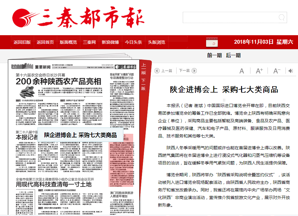 三秦都市报11月3日A3版报道陕企进博会上 采购七大类商品