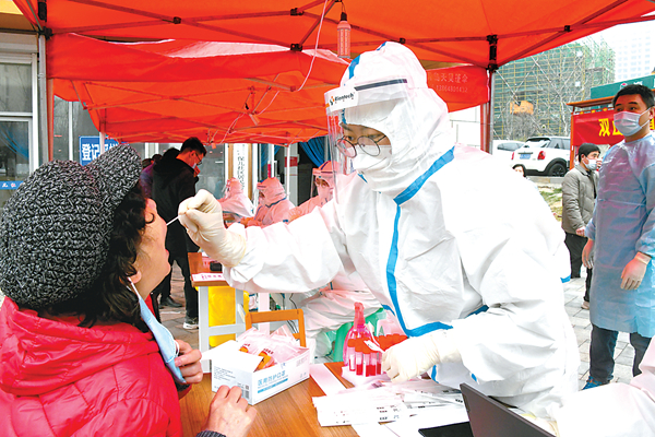 图为3月13日,市民在山东省青岛市市北区一检测点接受核酸采样。新华社记者 李紫恒 摄