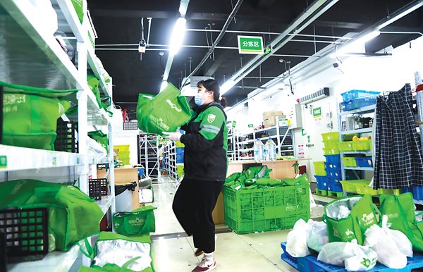 受疫情影响,上海居民出行减少,通过线上渠道购买生鲜物资的需求增多,本土生鲜零售企业全力投入市民菜篮子保障工作。 (图片来源:人民视觉)