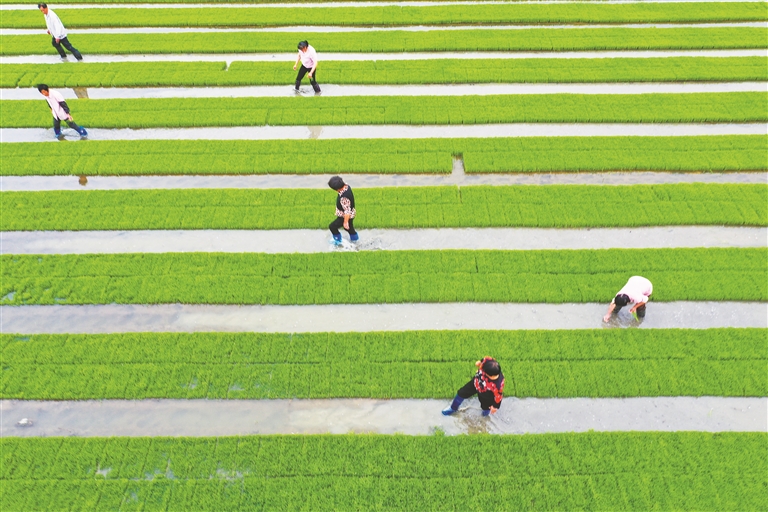 芒种时节,各地农民抢抓农时忙着犁田、插秧、施肥。 图为江苏省南通市如皋市东陈镇蒋宗村,村民正在进行水稻秧苗的田间管护。