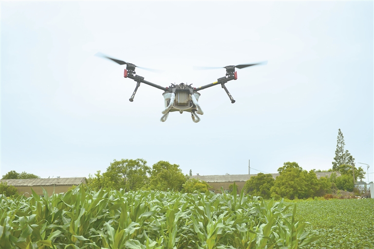 图为湖北省孝感市云梦县鑫盛蔬菜种植专业合作社组织农业植保无人机升空,对玉米地病虫害进行防治并喷洒营养液叶面肥。 (图片来源:视觉中国)